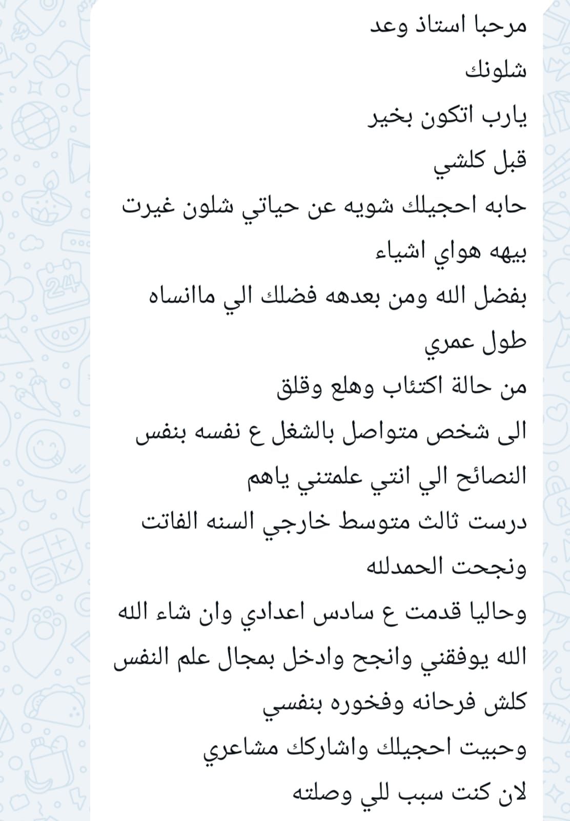 مرحبا استاذ وعد شلونك يارب اتكون بخيرقبل كلشي حابه احجيلك شويه عن حياتي شلون غيرت بيهه هواي اشياء بفضل الله ومن بعدهه فضلك الي ما انساه طول عمري من حالة اكتئاب وهلع وقلق الى شخص متواصل بالشغل ع نفسه بنفس النصائح الي انتي علمتني ياهم درست ثالث متوسط خارجي السنه الفاتت ونجحت الحمدلله وحاليا قدمت ع سادس اعدادي وان شاء الله الله يوفقني وانجح وادخل بمجال علم النفس كلش فرحانه وفخوره بنفسي وحبيت احجيلك واشاركك مشاعري لان كنت سبب للي وصلته.